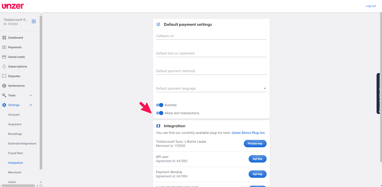 Under Settings > Integration activate the "Allow test transactions" button in Unzer Direct Manager.
